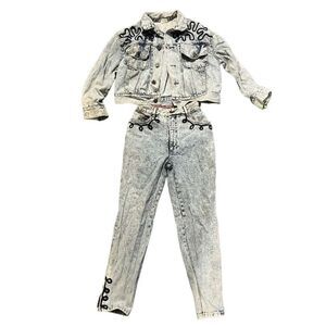 Vintage Bongo Denim Acid Wash Embroidered Jacket & Pants Set Size 5 & Small