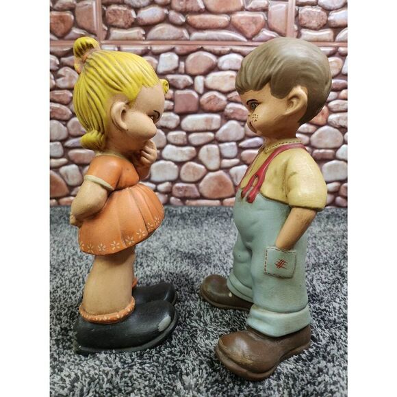 Cute freckled face boy with red suspenders and a little girl in an orange dress biting her finger.