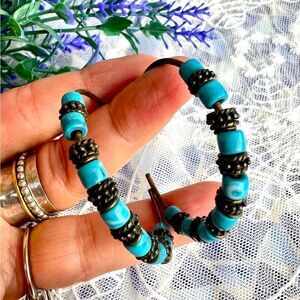 Eastern vibe - the brass beads alternate with blue, slightly marbled, acrylic beads.