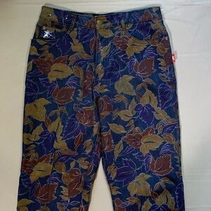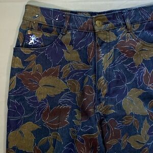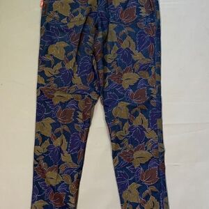 Dark blue (indigo) with leaf print in browns and outlined in white.