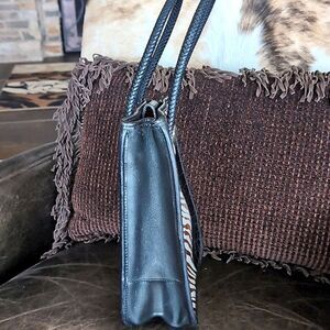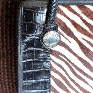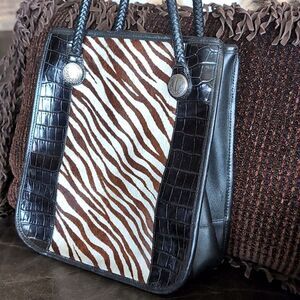 Stunning vintage black leather tote with zebra calf hair center accent on the front. Silver grommets, braided leather handles, snap closure, red cloth interior with zippered pocket. Large slip in pocket on the back🖤