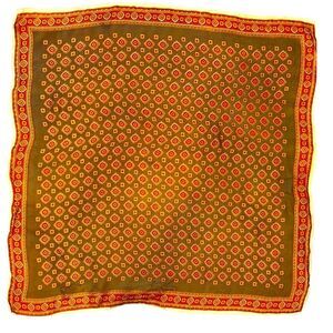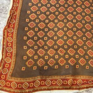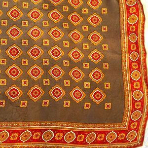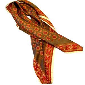Stylish scarf with a brown and orange geometric pattern. Perfect for adding a touch of elegance to any outfit. not sure of fabric content.