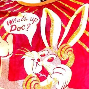 Dark red front printed Bugs Bunny cartoon image and gold glued glitter