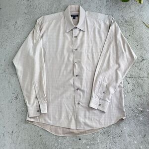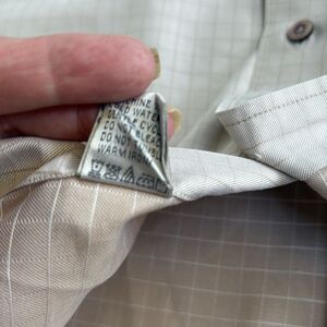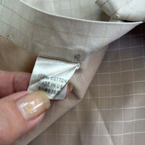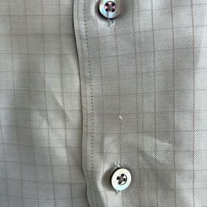 Please look at the pictures. It has a tiny little pull which I show in pictures. measuring across the shoulders is20 pit to pit 24 from the bottom of the collar to the bottom of the shirt is 31 from the top of the shoulder to the bottom of the sleeve is 24. Color is a very light creamy beige.