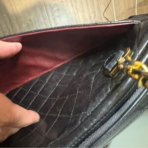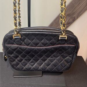 Vintage Chanel quilted gold and black chain bag. This is a pre-loved item so please see pics for wear. This bag is in very good condition. Call out is the CC Tag on the zipper is ripped. Can be fixed by a cobbler.