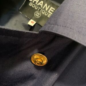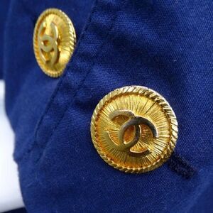 Additional Information: Stunning navy Chanel belted trench coat dates from the 1980's. Features notched lapels, front button closure, gold buttons with CC logo. Two vertically aligned oversized patch pockets on each side with single button on each flap. Loose fitting sleeves have cuffs with single button on each wrist. Non buckle self tie belt.