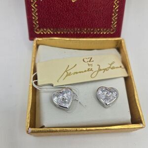 Vintage CZ by Kenneth Jay Lane Heart Stone Stud Earrings Silver Tone NEW