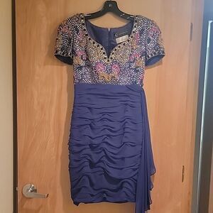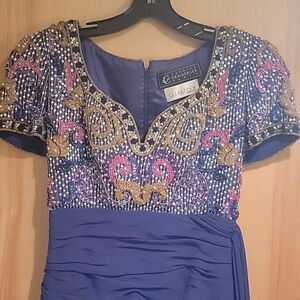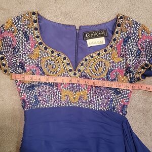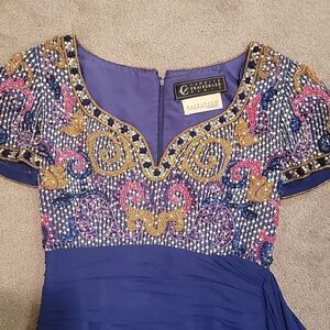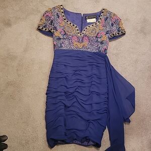 perfect condition other than discoloration under armpits on the inside only. no beads or sequins missing. royal blue. fully lined. size 2/4 . no tag on inside. see measurements