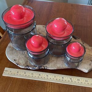 In great condition! Super fun Vintage / MCM / Retro Canister Set. Smoke Gray Acrylic with Red Ball shaped sealing lids. One small crack in the 2nd one, see last photo, not a hole but a crack on the edge. Otherwise in great condition and a super fun retro look! Made in Hong Kong.