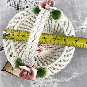 Beautiful small white basket with roses on the handle. With original certificate Made in Italy unfortunately there are minor chips on the leaf as shown in the last photo Diameter approximately 7 inches