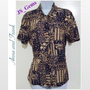 Anna and Frank blue & tan floral pattern 6 button down 100% silk shirt. Features 2” side slits. Approx. arm pit to arm pit 21”, arm 8”, & 27”T. May need a slight low ironing, tag came off in delicate cold cycle wash & tremble dry. Ask any questions before purchasing. Enjoy buying from an Ambassador. Same or Next Day Shipping 🎁 Make an Offer to Save 😊💕 All sales final & sold as is