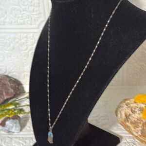 Dainty spiral chain stamped 925 Italy. Adorned with vintage antique blue enamel pin pendant Miraculous Medal Mary charm. Pendant appears to be Jesus. Pendant is not marked and not magnetic. Good vintage condition with signs of age to metals.