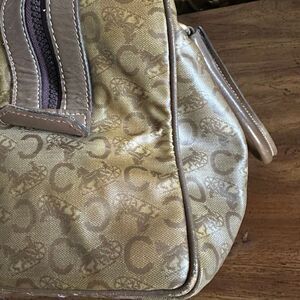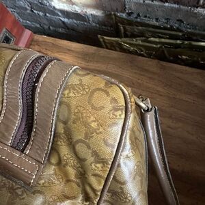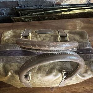 PLEASE NOTE: There is some discoloration throughout the coated canvas, slight corner wear, and some wear to the handles (refer to pics). This is a vintage, pre-owned item with basic wear and fade. Please refer to the pictures and size measurements.
