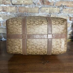 Vintage Celine Mini Boston Bag is monogram coated canvas with leather trim and brass hardware, and has the logo embossed on front, leather double handles and zipper closure.