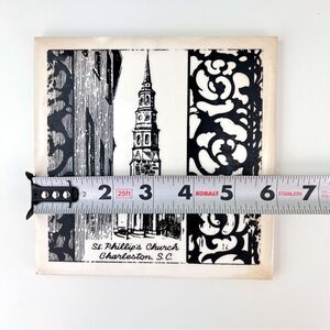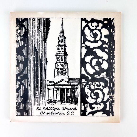 This is an unusual, vintage 1960s or so, ceramic tile trivet made by SORIANO CERAMICS. It is square in shape and measures 6x6 inches in size. It features Saint Philip's Church, Charleston, S.C. on a white background. Backed with cork.