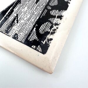 Tile looks good but has some small chips and discoloration, cork backing has a divit which of course does not compromise the piece. Please see all the pictures for more details.