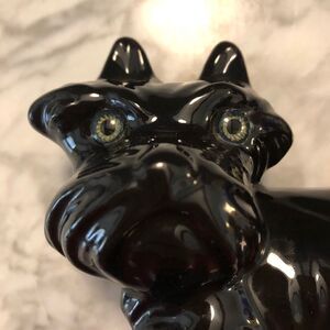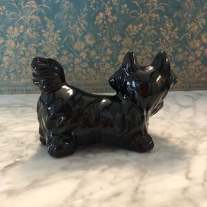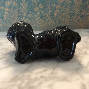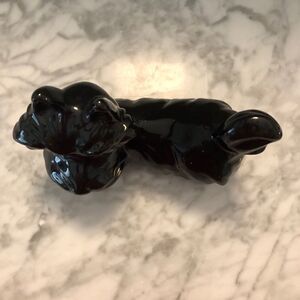 This vintage figurine is in excellent condition. It is adorable too! I think it’s a Scottie dog, but it kind of has a cartoonish look about it. This little guy is super shiny black glazed and has little green inset eyes. It is marked AS on the bottom. It is approximately 5” long and 3 1/2” tall.
