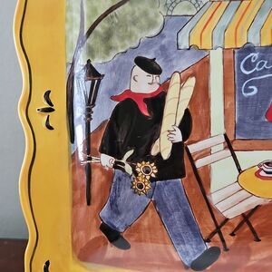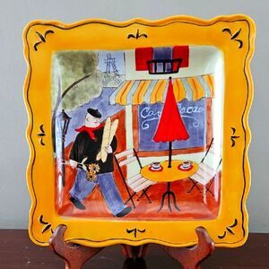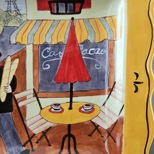 Certified International's decorative plate features a vibrant French cafe scene. The plates colorful design includes shades of yellow, red, and black definitely making it a conversation piece. The plate is dishwasher and microwave safe.