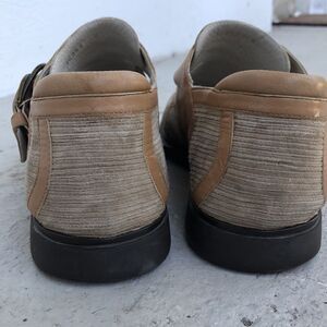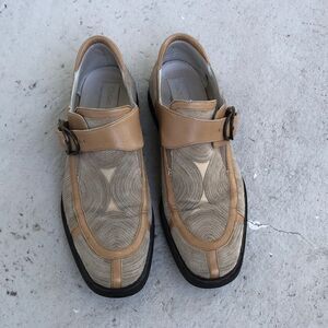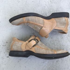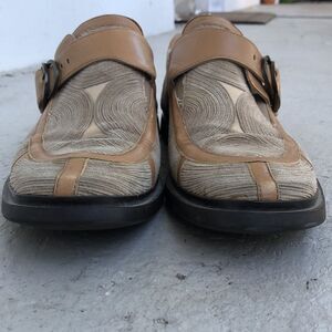These are great leather trim and the circular designs are suede on a canvas back. Rubber soles. They need a little bit of cleanup but are in good condition. Leather is tan and suede is a dark beige. Color in pictures is true.