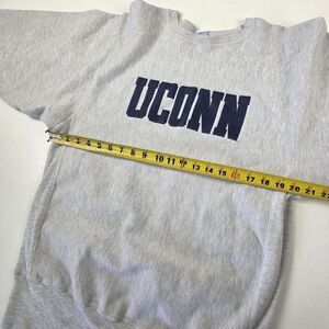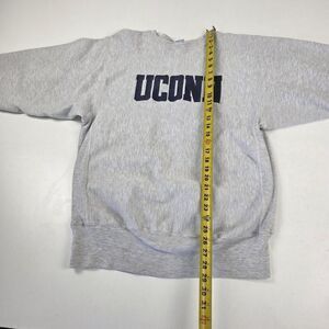 The Vintage Champion Reverse Weave UCONN Sweatshirt in gray is a stylish and comfortable pullover sweatshirt with a crew neck and long sleeves. Made of heavyweight fleece cotton material, this XL size sweatshirt features a graphic print of the UCONN logo and is part of the Champion Reverse Weave product line. Perfect for activities like walking, cross training, and basketball, this 90s-themed sweatshirt offers a regular fit and is a great addition to any vintage enthusiast's wardrobe.