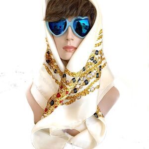 Absolutely stunning silk satin scarf by Chanel, the fabric is a liquid smooth satin silk, with hand rolled hems..This has a beautiful wide border design of Gripox jewels in rich jewel tone colors. The scarf background is a soft Ivory color..Measures 36" x 36", the scarf is in very good vintage condition. it has 3 visible tiny slightly larger than a pin head spots, (sereally not noticeable when worn, possibly from the original printing...No other signs of use or wear..Really stunning accessory