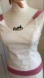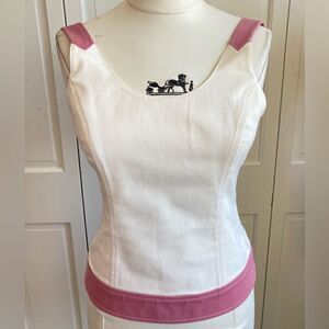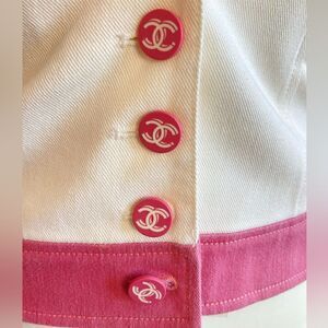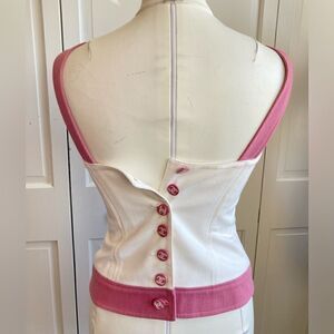 Vintage Chanel ensemble from Spring 2004.The top consists of pink straps and pink and white Chanel logo button closures in the back.