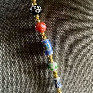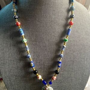 Long Chinese multicolored ceramic bead with gold tone spacers & ceramic heart pendant.