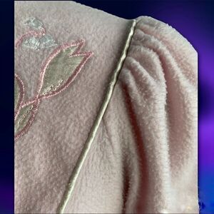 Fabulous fuzzy soft feminine Christian Dior designer front zip robe. Beautiful embroidered and applicae ribbon design on the front. Very soft fabric, 2 side pockets, gathered cuff sleeves. Very nice condition. Please see all photos for full description.