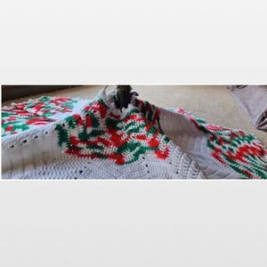 Vintage Christmas Tree Skirt Hand Crochet Snowflake Red Green White Grandma 70s