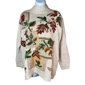 Vintage Chrysantheme Fall Sweater. Mock neck. Perfect colors for fall. Good condition, there are a couples flaws seen in pics, a small hole not to noticeable and a couple stains on the back untreated. Shoulder pads. Size Medium, see pics for measurements.