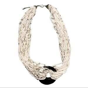 Vintage Chunky Seed Bead Multi Strand White Statement Necklace with Black Acrylic Pendant