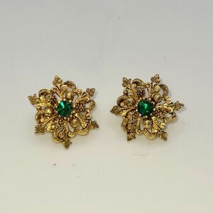 Vintage Clip On Earrings. Gold Toned With Green Rhinestone Center