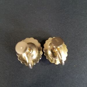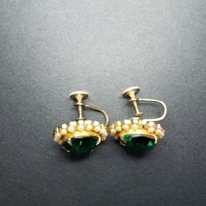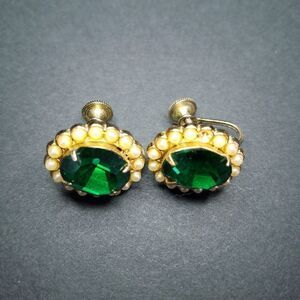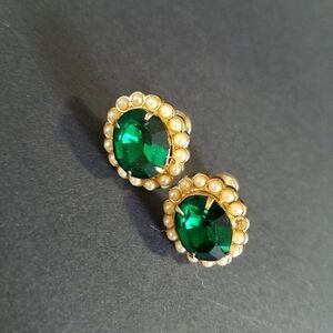 This lovely set of vintage earrings would be the perfect addition to any collection. With a large green emerald rhinestone in the center and surrounded by small faux pearl in an oval shape. The setting is a gold tone metal. measures .75" long by .5" wide. They are in good vintage condition. The only issue I can see is that one of the little pearls from around the rhinestone is missing. It is not very noticeable, but worth noting.