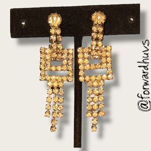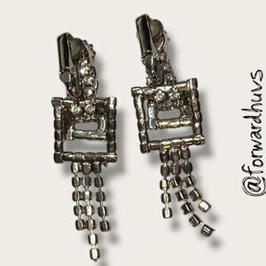 These vintage clip-on earrings exude timeless elegance and are reminiscent of the 1950s, though the exact era is uncertain. Measuring approximately 2.25 inches from top to bottom, they are a striking accessory that captures the sophistication of mid-century style.