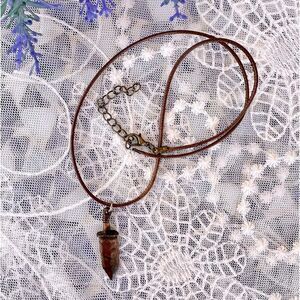 I’ve placed on a new 18” brown fiber cord with bronze tone lobster clasp and 2” extender chain. Unisex. Please see all photos as these give best idea of condition and size.