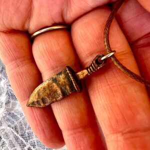 Copper knife pendant - a thick dagger with nice details. I don’t know if this is solid copper or copper tone - I do see slight greening on the backside that I haven’t tried to remove, so likely does have genuine copper content. Unable to date.