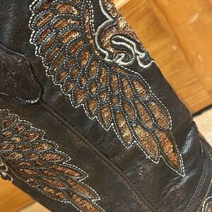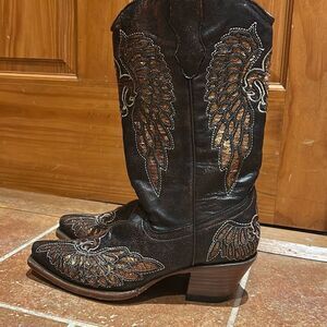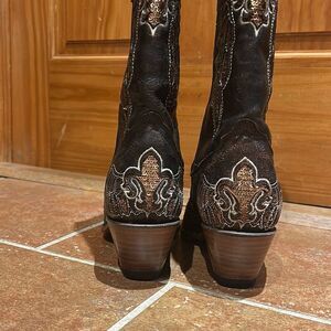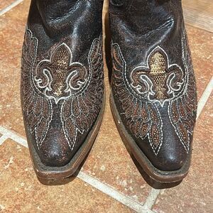 Vintage Corral Boots in excellent condition (check out the bottoms!!!). Size 7 ladies brown boots with brown/bronze sequin embellishments. Leather. Made in Mexico.