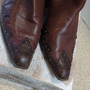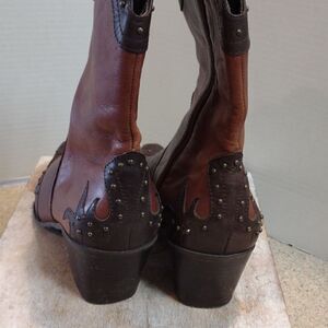 Great looking vintage boots with soft supple exteriors and peeling interior. Side Zip and brass studs on the exterior. SEE Pictures as they are part of the description.