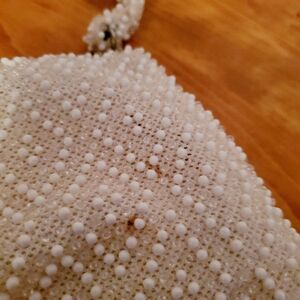 Beautiful vintage small cream colored beaded embellished evening bag. Small coing bag included. Small imperfection as pictured. I can't make out the brand with 100% accuracy. Pre-owned in great condition. Please refer to pictures for best description and condition verification prior to purchase.