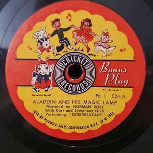 This is a Vintage Cricket Records Alladin and his Magic Lamp 78 vinyl with Sleeve C24. It plays well. The sleeve shows wear and a tear.