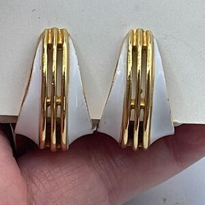 Vintage Crown Trifari teardrop shaped hoops. Clip style backs. Clearly stamped on backs. White enamel on fronts.
