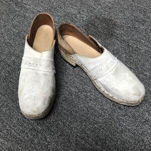 Vintage Custom Wooden Clog White Brown Swedish Leather Handmade Goodyear Soles 7. Leather tops with tacking and wooden bases Goodyear hard rubber soles noticeable wear but in good functional condition no marked size toe to heel outside 10” interior length 9.5” wide 3.5” aged patina to the wood and leather white washed strong and useable or for display