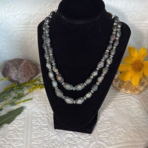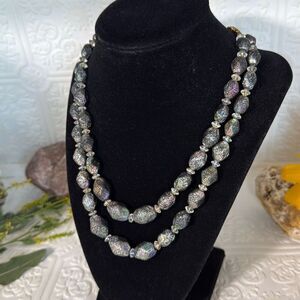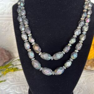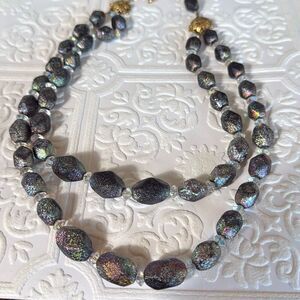Vintage Czech Black Iridescent Textured Glass Bead Necklace Double Strand 18.5”