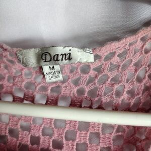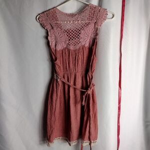 vintage Dani, rose colored, rayon nylon blend dress with crochet upper bodice and trim. pit to pit 18" length 30"