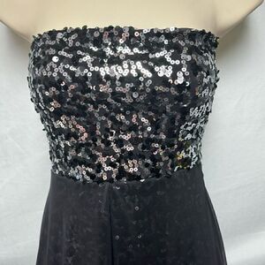 Vintage Y2K Deb Prom dress. New old stock. New with tags. Perfect condition. Black and silver sequins on dress. Slip-on dress with tie at back. Elastic material. Please see measurements below for fit. Measurements taken lying flat.