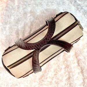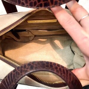 Great vintage condition handbag by Diane von Furstenberg. Cream canvas medium sized handbag/small travel bab with brown crocodile embossed leather. Gold embellishments and metal zipper with DVF logo zipper pull. Tan suede lining with two side slip pockets and one zip pocket with leather zipper pull. Inner gold tone metal plate embossed with Diane von Furstenberg. 1990s-Y2K era.