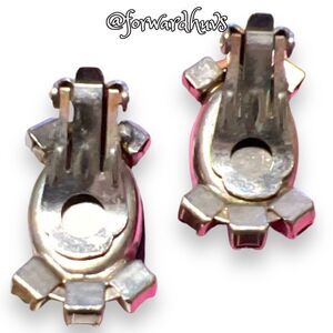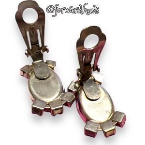 These vintage clip-on earrings showcase an eye-catching central oval cabochon stone with a dynamic blend of dark blue and reddish-pink hues. The iridescent effect, characteristic of dichroic glass, creates a stunning play of colors that shifts depending on the angle of light. Surrounding the central stone are small, round, prong-set pink rhinestones, adding a delicate sparkle that enhances the overall design.