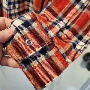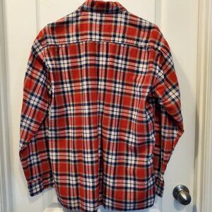 About this item: Vintage Super Soft Red, White & Blue Flannel! Material: 100% Cotton Flannel – soft, breathable, and warm. Details: Full button-front closure, two chest pockets with button flaps, and button cuffs. Style: Classic fit, ideal for layering over a tee or wearing on its own.
