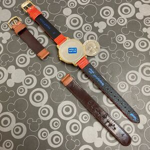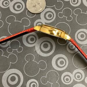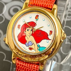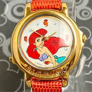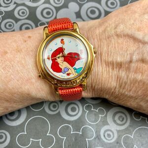 RARE vintage Disney X Lorus by Seiko Ariel, The Little Mermaid, musical animated watch. Watch features a gold-tone case with Ariel on the dial. It plays, "Under the Sea" when you push the button on the left side of the watch, and the second-hand dances along! See video of the watch in action! The watch case measures approx. 34mm across excluding crown, and watch with red lizard embossed leather strap measures approx. 8 1/2" (max wrist size of approx. 6 3/4"). Watch is in good vintage condition some light imperfections in the plastic crystal (no cracks) and light scuffs to the case. The lizard embossed strap is not original to the watch but complements Ariel's red hair. I will also include the original strap, which looks good from the front, but has deterioration of the man made backing. Watch has a new battery and keeping time. Perfect watch for the Disney / Little Mermaid fan! Thanks for checking out my closet!