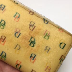 Vintage Y2K Dooney and Bourke coated canvas cream signature print long wallet. This is an accordion style zip around, which is my favorite style of Wallet because it keeps everything in your wallet nice and secure. Interior has tons of card slots, and coin pouch is very clean. The interior appears to be a vachetta leather with a denim colored canvas. Dooney & Bourke pink heart zipper pull. Minor marks and signs of wear throughout and some color transfer on the back, but it’s still so nice and Y2K amazing. The rainbow zipper makes this wallet to me!! Please see all photos which includes measurements as well as condition.
